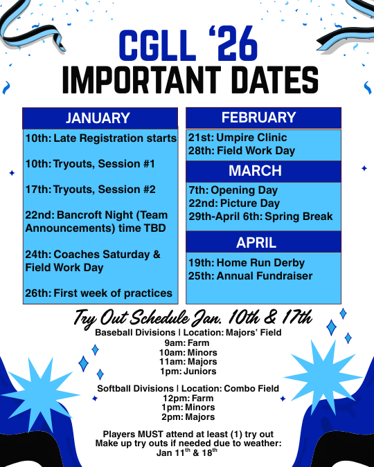 Make up try outs if needed due to weather: Jan 11th & 18th